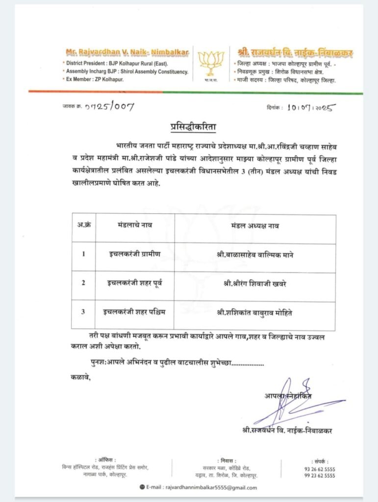 भाजपच्या पदाधिकाऱ्या मध्ये यावेळी प्रथमच बदल करण्यात आला.एक शहर अध्यक्ष ऐवजी बूथ अनुसरून तीन मंडळ अधिकारी निवडण्याचे निश्चित झाले होते.इचलकरंजी ग्रामीणसाठी बाळासाहेब माने, इचलकरंजी शहर पश्चिम साठी शशिकांत मोहिते यांची निवड झाली होती मात्र इचलकरंजी शहर पूर्व च्या नावावर राहुल आवाडे आणि सुरेश हाळवणकर यांच्यात कामत होत नव्हते अखेर आज इचलकरंजी शहर पूर्व श्रीरंग खवरे यांच्या नावावर शिक्कामोर्तब झाल्यानंतर तिन्ही नावे जिल्हा अध्यक्ष राजवर्धन नाईक निंबाळकर यांनी जाहीर केली.आज जाहीर झालेल्या या निवडीबद्दल कोणतीही प्रतिक्रिया देण्यास माजी आमदार सुरेश हाळवणकर यांनी नकार दिला.
