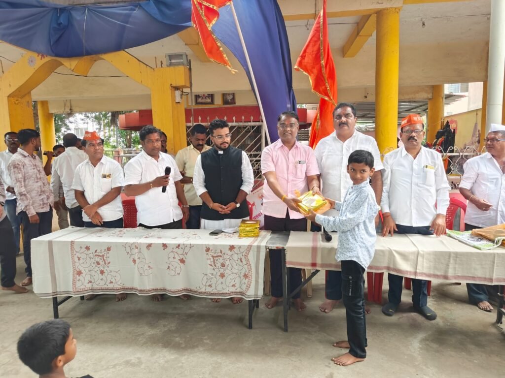 दत्त मंदिरात विद्यार्थ्यांना शैक्षिणक साहित्याचे वाटप विठ्ठल चोपडे व समाजातील मान्यवरांच्या हस्ते करण्यात आले.विक्रम सकपाळ यांनी इंदुलकर यांचा सत्कार केला.सकाळी मावळा ग्रुपचे अमर काशीद व शुभम राऊत यांच्या मार्गदर्शनाखाली 26 समाज बांधवांनी शिवज्योत पन्हाळगडावरून आणली होती.यावेळी रविंद्र क्षिरसागर, भरत मर्दाने, बाबुराव जाधव, आनंदा जाधव , सुरेंद्र सपकाळ, जयसिंग संकपाळ, बंडू जाधव, मारुती काशीद, रघुनाथ जाधव, बाबासाहेब खंडागळे, हिंदुराव राऊत, आनंदा साळोखे, तुषार जगताप, बाळासो पोवार, विनायक चव्हाण ,हेमंत साळुंखे, पवन शिंगे, नामदेव शिंगे, बापू सपकाळ, दिपक चव्हाण, अमर इंगळे, सचिन शिंगे,शुभम राऊत, गणेश गवळी, सुनील कोरे , दिपक जाधव, अमर काशीद, अर्जुन जाधव, सागर शिंगे, गणेश टिपुगडे, प्रमोद शिंगे,राहुल डिग्रजकर, सिद्धांत जाधव, सुनील साळुंखे, हर्षद साळुंखे, सोमनाथ काशीद ,नेताजी सपकाळे, नीरज सपकाळे ,अमोल घाडगे, शुभम गवळी, आनंद सूर्यवंशी, संतोष म्हेत्रे आदी उपस्थित होते.