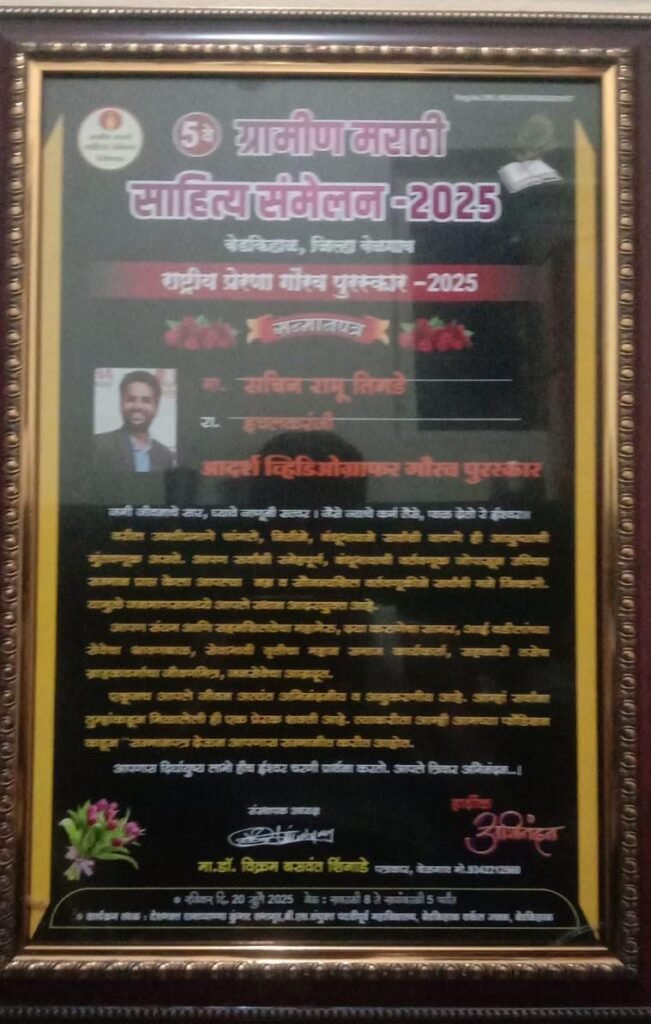 बेडकिहाळ, (ता. चिकोडी) झालेल्या ५ व्या ग्रामीण मराठी साहित्य संमेलन-2025 मध्ये येथील व्हिडिओग्राफर सचिन रामू तिगडी यांना आदर्श व्हिडिओग्राफर या राष्ट्रीय प्रेरणा गौरव पुरस्काराने गौरविण्यात आले.