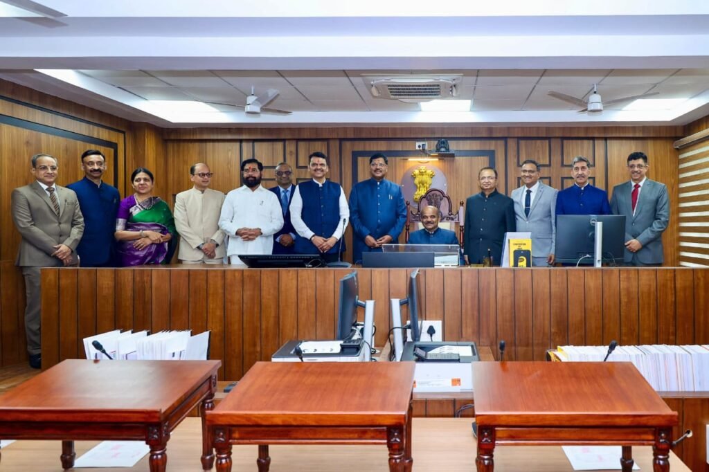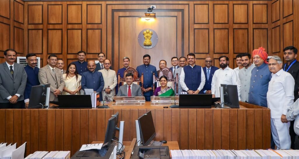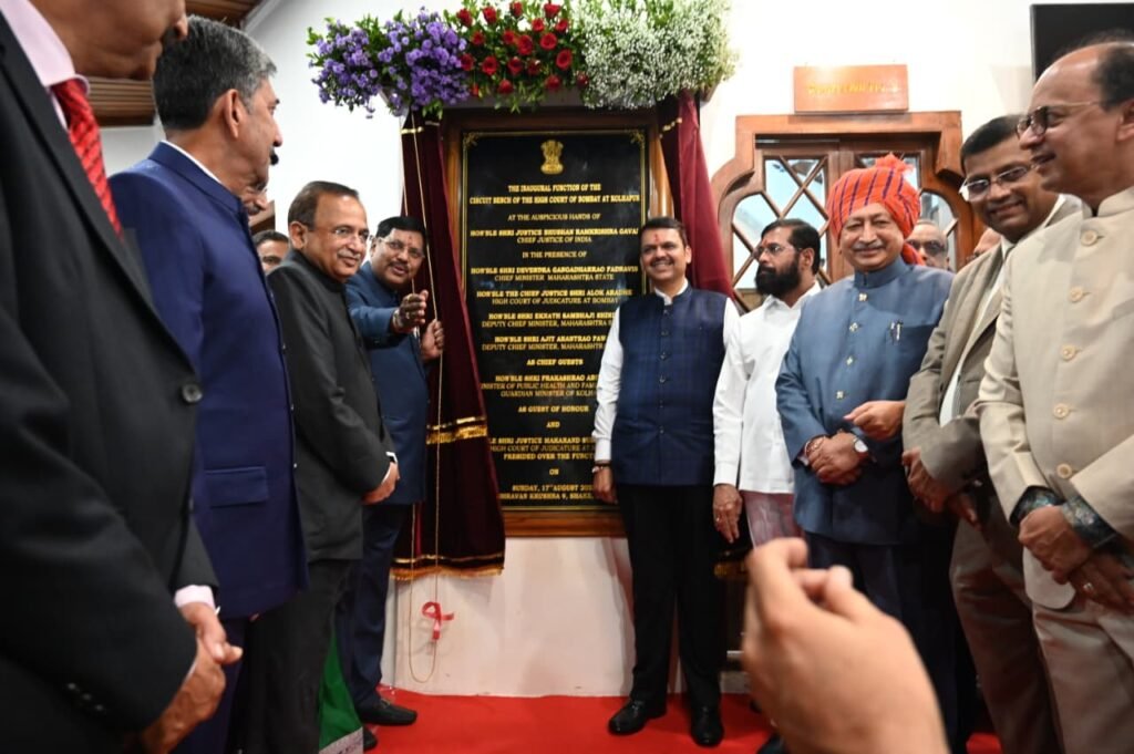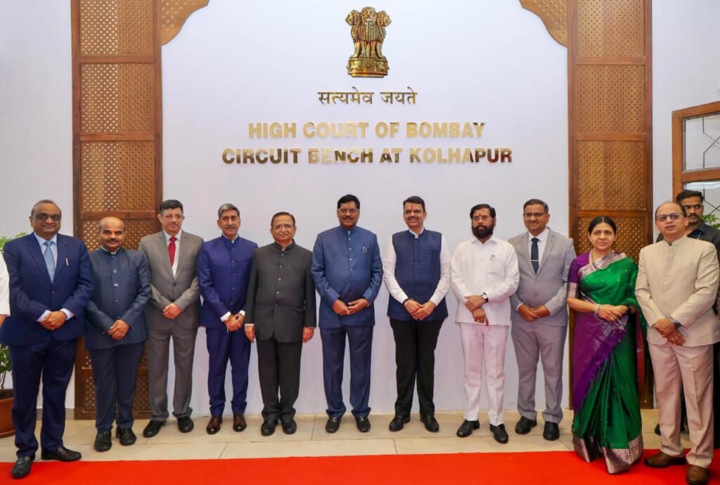 कोल्हापूर सर्किट बेंचच्या उद्घाटन प्रसंगी, भारताचे मा. सरन्यायाधीश भूषण गवईजी आणि मुख्यमंत्री देवेंद्र फडणवीस यांचे मुंबई उच्च न्यायालयाचे मा. मुख्य न्यायमूर्ती आलोक आराधे, उपमुख्यमंत्री एकनाथ शिंदे आणि इतर मान्यवर यांच्या समवेत छायाचित्र.