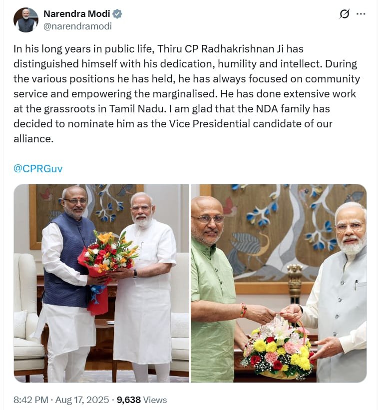 नवी दिल्ली : राष्ट्रीय लोकशाही आघाडी (एनडीए) ने उपराष्ट्रपतीपदाचे उमेदवार म्हणून महाराष्ट्राचे राज्यपाल माननीय सी.पी. राधाकृष्णन यांची निवड केली.विविध राज्यांमध्ये संसद सदस्य आणि राज्यपाल म्हणून काम करताना, माननीय राज्यपाल राधाकृष्णन यांनी विविध कायदेविषयक आणि घटनात्मक बाबींमध्ये व्यापक कौशल्य मिळवले आहे. उपराष्ट्रपती जयदीप धनगर यांनी राजीनामा दिल्यानंतर रिक्त झालेल्या जागेवर राधाकृष्णन यांची निवड केली आहे.