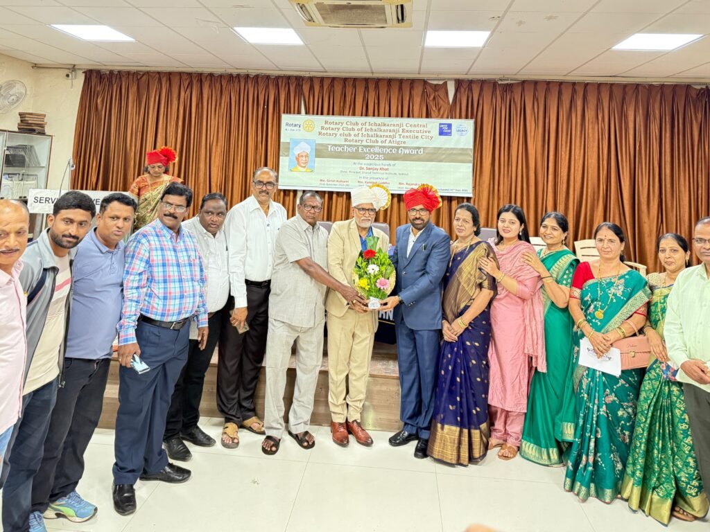 इचलकरंजी : येथील डी. के. ए. एस. सी. महाविद्यालयाचे प्राचार्य प्रो.(डॉ.) एस. के. खाडे यांना रोटरी क्लब ऑफ सेंट्रल, रोटरी क्लब ऑफ एक्झिक्युटिव्ह, रोटरी क्लब ऑफ टेक्स्टाईल आणि रोटरी क्लब ऑफ अतिग्रे यांच्या संयुक्त विद्यमाने दिला जाणारा ‘टीचर एक्सलन्स अवार्ड 2025’ नुकताच पुरस्कार सोहळ्याचे प्रमुख पाहुणे मा. प्राचार्य डॉ. संजय खोत यांच्या हस्ते प्रदान करण्यात आला. प्राचार्य डॉ. एस. के. खाडे यांनी आपल्या एकूणच सेवा काळात एक विद्यार्थी प्रिय गुरुदेव कार्यकर्ते म्हणून ज्ञानदानाचे कार्य केले आहे. वनस्पतीशास्त्र या विषयाचे अध्यापन करत अनेक विविध संशोधन देखील त्यांनी केले आहे. प्राचार्य म्हणून कार्यरत असताना त्यांचा प्रत्येक विद्यार्थ्यांच्या समस्या ते स्वतः जाणून घेऊन विद्यार्थ्यांशी सुसंवाद करीत असतात. म्हणूनच त्यांची विद्यार्थी प्रिय प्राचार्य अशी ओळख आहे. “विद्यार्थी हा शिक्षणाचा केंद्रबिंदू असून त्याच्या सर्वांगीण विकासासाठी विद्यार्थ्यांशी संवाद असणे गरजेचे आहे. शैक्षणिक प्रगती बरोबर विद्यार्थी वैयक्तिक आयुष्यात यशस्वी होण्यासाठी आम्ही शिक्षकांनी नेहमीच त्यांच्या पाठीशी उभे राहायला हवे. मला मिळालेला हा पुरस्कार बापूजींचे संस्कार, सहकारी गुरुदेव कार्यकर्त्यांची सोबत आणि विद्यार्थी या सर्वांमुळे आहे.” अशा भावना यावेळी प्राचार्य डॉ. एस. के. खाडे यांनी व्यक्त केल्या. रोटरी क्लबच्या चारही शाखांच्या वतीने त्यांना यंदाचा हा पुरस्कार प्रदान करण्यात आला.