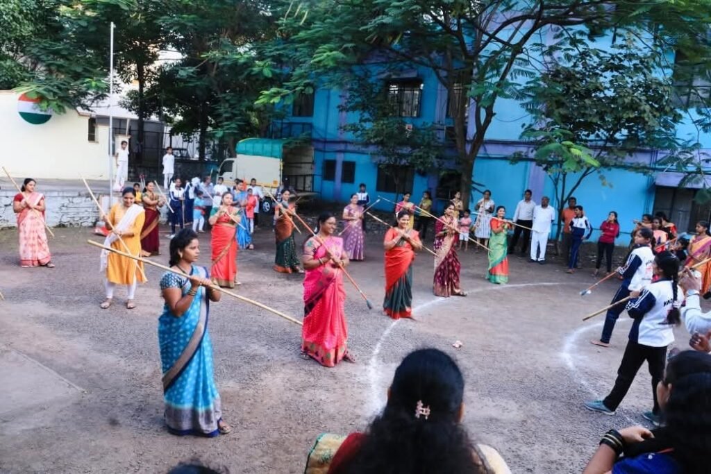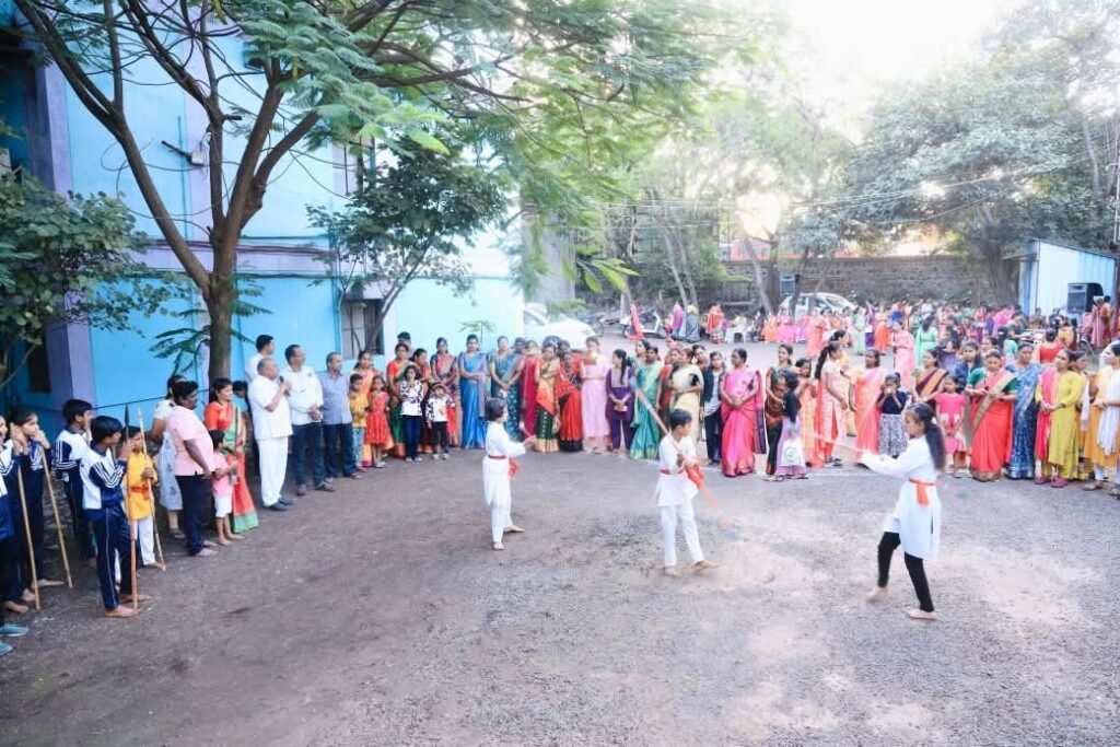 या उत्सवात महिलांनी पारंपरिक वेशभूषेत सजून “ऐलमा पैलमा गणेश देवा”, “हत्ती आला हत्ती आला” अशा ओव्या म्हणत नृत्य व गाणी सादर केली. संपूर्ण परिसरात आनंद, हशा आणि टाळ्यांचा गजर होत होता. फोटोतील दृश्यांमध्ये महिलांनी मोठ्या गोलाकार फेरात नाचत पारंपरिक गाणी म्हणत सण साजरा केला. तसेच महिला सह -मुलींनी सादर केलेल्या लाठी काठी प्रात्यक्षिकाने महिला सुरक्षेचा संदेश दिला.